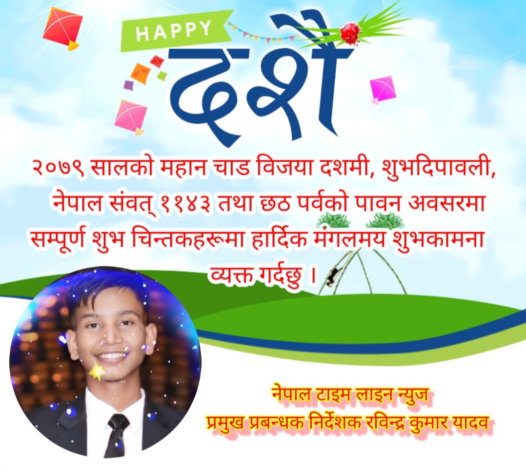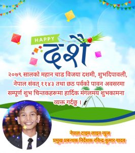 नेपाली हिन्दूहरुको महान् चाड विजयदशमीको पावन अवसरमा सम्पूर्ण पाठक, दर्शक, देशबासी,नगरबासी तथा गाउबासीहरु,विज्ञापनदाता, सरकारी अधिकारी,राजनितिक कर्मि, संचारकर्मी एवम् पत्रकार, पेशाकर्मी, अधिकारकर्मी तथा आम शुभचिन्तकहरुमा उतोरोतर प्रगति,सुख, शान्ति र समृद्धिका साथै आपसी सद्भाव र भाइचाराको विकासबाट समृद्ध र सभ्य समाजको निर्माणमा योगदानको इक्छा आकांक्षा पूरा होस सबैमा हार्दिक शुभकामना व्यक्त गर्दछौं ।