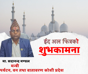 पर्यटन, वन तथा वातावरण मन्त्री मा. सदानन्द मण्डलले इस्लाम धर्मावलम्बीहरू लगायत सम्पूर्ण नेपाली दाजुभाइ तथा दिदीबहिनीहरूलाई ईद-उल-फित्र पर्वको अवसरमा शुभकामना व्यक्त गर्नुभएको छ। उहाँले रमजान रोजा अर्थात् ईद-उल-फित्रको पावन अवसरमा स्वदेश तथा विदेशमा रहेका इस्लाम धर्मावलम्बी समुदायलाई विशेष रूपमा बधाई दिँदै सुस्वास्थ्य, सुख, शान्ति एवं समृद्धिको कामना गर्नुभएको छ।