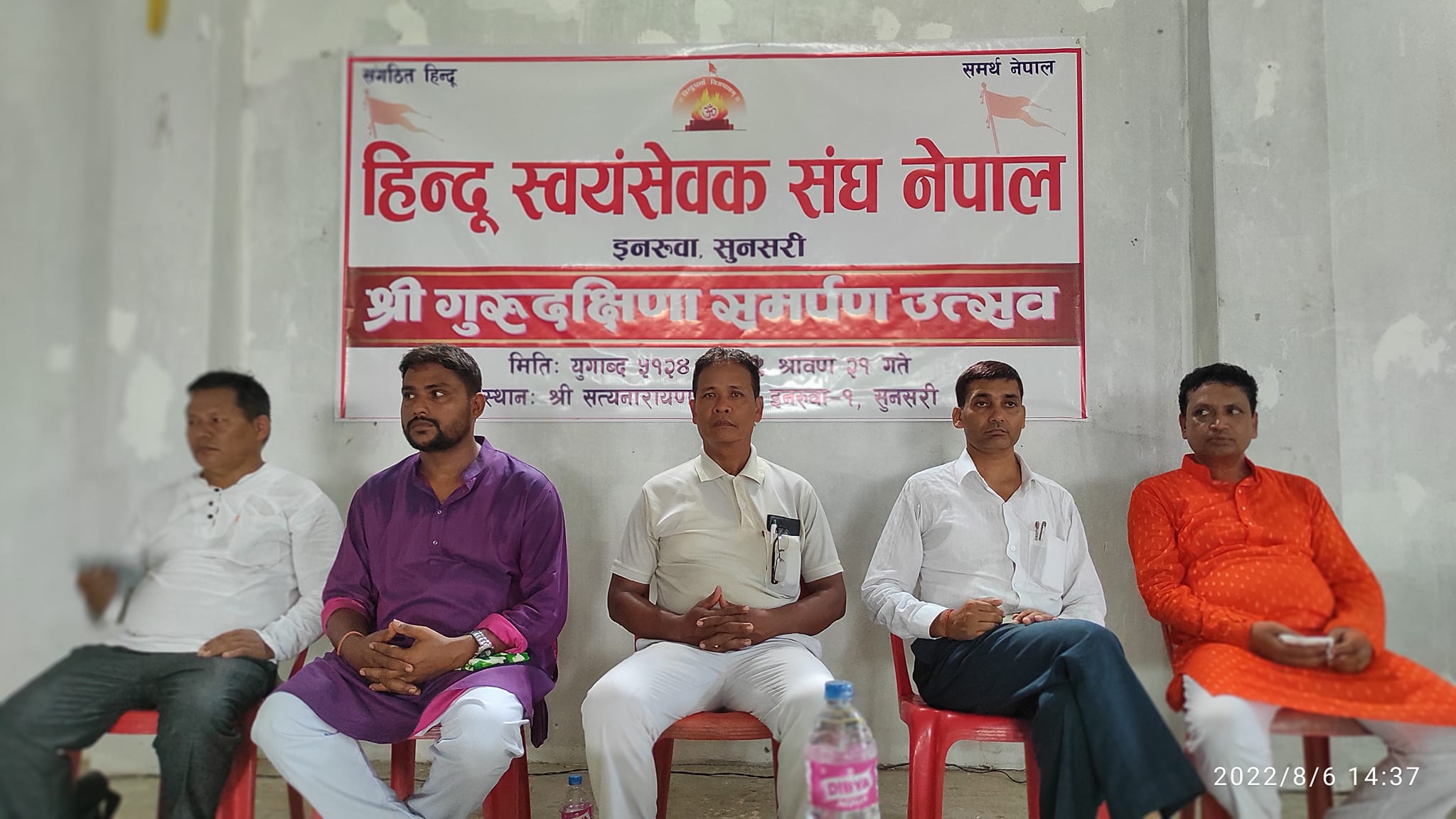 सुनसरीको सदरमुकाम इनरुवामा हिन्दु स्वयंसेवक संघ नेपालको आयोजनामा भव्य रुपमा गुरु दक्षिणा समपर्ण उत्सव कार्यक्रम सम्पन्न भएको छ । आफ्नो धर्म संस्कृती परम्परा अनी रिती थितीको संरक्षण गरौं पर धर्मीहरुको लहैलहैमा लागेर आफ्नो सनातनी परम्परा नमासौं भन्दौ धर्म रक्षाको लागि काम गर्दै आएको हिन्दु स्वयंसेवक संघ नेपालले इनरुवामा गुरु दक्षिणा समर्पण उत्सव कार्यक्रम गरेको हो ।