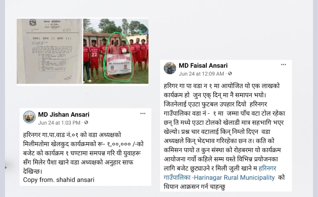 इनरूवा । फुटबल प्रतियोगिताको नाममा सुनसरीको हरिनगर गाउँपालिका वडा-१ वडा अध्यक्ष प्रवीण गुप्ताले नियम विपरीत १ लाख निकासा गरेको पाइएको छ ।
