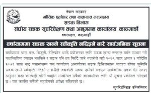 सडक विभाग संघीय सडक सुपरिवेक्षण तथा अनुगमन कार्यालय, काठमाडौंले बुधबार सार्वजनिक सूचना निकाल्दै कसैले जबर्जस्ती सडक खनेको पाइए सार्वजनिक सडक ऐन २०३१ अनुसार कडा कारबाही गरिने चेतावनी पनि दिएको छ।