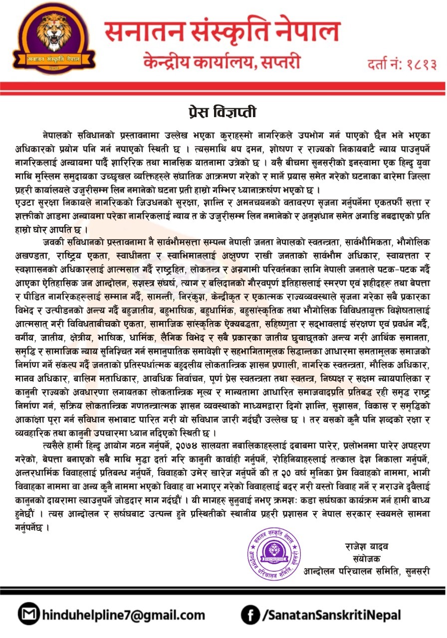 त्यसैले हामी हिन्दु आयोग गठन गर्नुपर्ने, २०७४ सालयता नबालिकाहरुलाई दबाबमा पारेर, प्रलोभनमा पारेर अपहरण गरेको, बेपत्ता बनाएको सबै माथि मुद्धा दर्ता गरि कानुनी कार्वाही गर्नुपर्ने, रोहिनियाहरुलाई तत्काल देश निकाला गर्नुपर्ने, अन्तरधार्मिक विवाहलाई प्रतिबन्ध गर्नुपर्ने , विवाहको उमेर खारेज गर्नुपर्ने की त २० वर्ष मुनिका प्रेम विवाहको नाममा, भागी विवाहका नाममा वा अन्य कुनै नाममा भएको विवाह वा भगाएर गरेको विवाहलाई बदर गरी यस्तो विवाह गर्ने र गराउने दुवैलाई कानुनको दायरामा ल्याउनुपर्ने जोडदार माग गर्दछौं । यी मागहरु सुनुवाई नभए क्रमशः कडा सर्घषका कार्यक्रम गर्न हामी बाध्य हुनेछौं । त्यस आन्दोलन र सर्षघबाट उत्पन्न हुने प्रस्थितीको स्थानीय प्रहरी प्रशासन र नेपाल सरकार स्वयमले सामना गर्नुपर्नेछ । भन्नै विज्ञप्ती जारी रहेको छ ।