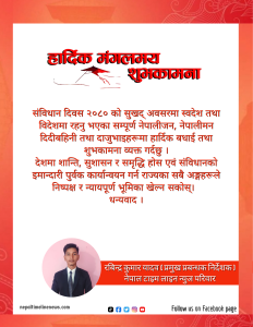 काठमाडौँ । संविधान दिवस, २०८० आज देशभर विभिन्न कार्यक्रम गरी मनाइँदैछ । देशभरका सरकारी तथा निजी कार्यालय, विदेशस्थित कूटनीतिक नियोग, राजनीतिक दल, नागरिक समाज, सङ्घसंस्थालगायतले विभिन्न कार्यक्रम गरी संविधान दिवस मनाउँदैछन् ।
