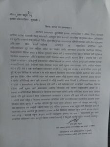 वडाको जनप्रतिनिधिको हैसियतमा म विधालय व्यवस्थापन समिति छनौट समितिको सदस्य समेत रहेकोमा मलाई पनि कुनै जानकारी विना अभिभावकको मनोभावना र सदभाव प्रति प्रहार गर्ने काम गरेकोले निन्दा र आपती प्रकट गर्दछु । विधालय व्यवस्थापन समितिका लागि नगरपालिकाबाट राजनीतिक हस्तक्षेप स्वरुप निर्धारण गरेको प्रकृया नै स्थगित गरिएको हुँदा गठन प्रकृया अविलम्ब सुचारु गर्न जोडदार माग गर्दछु ।