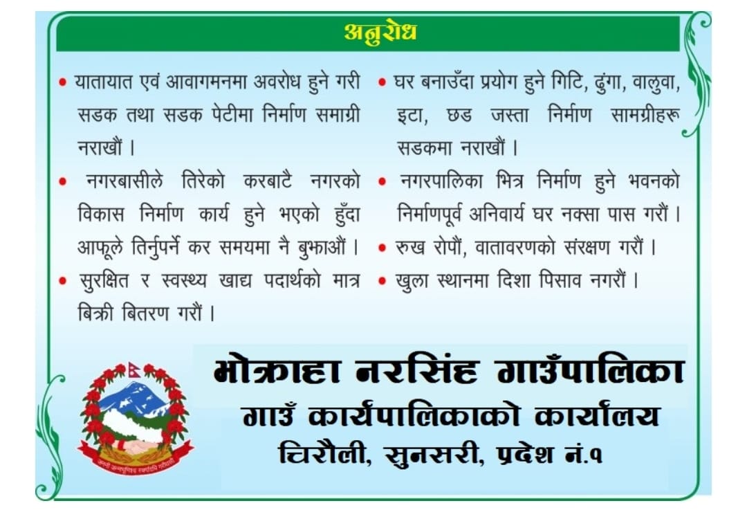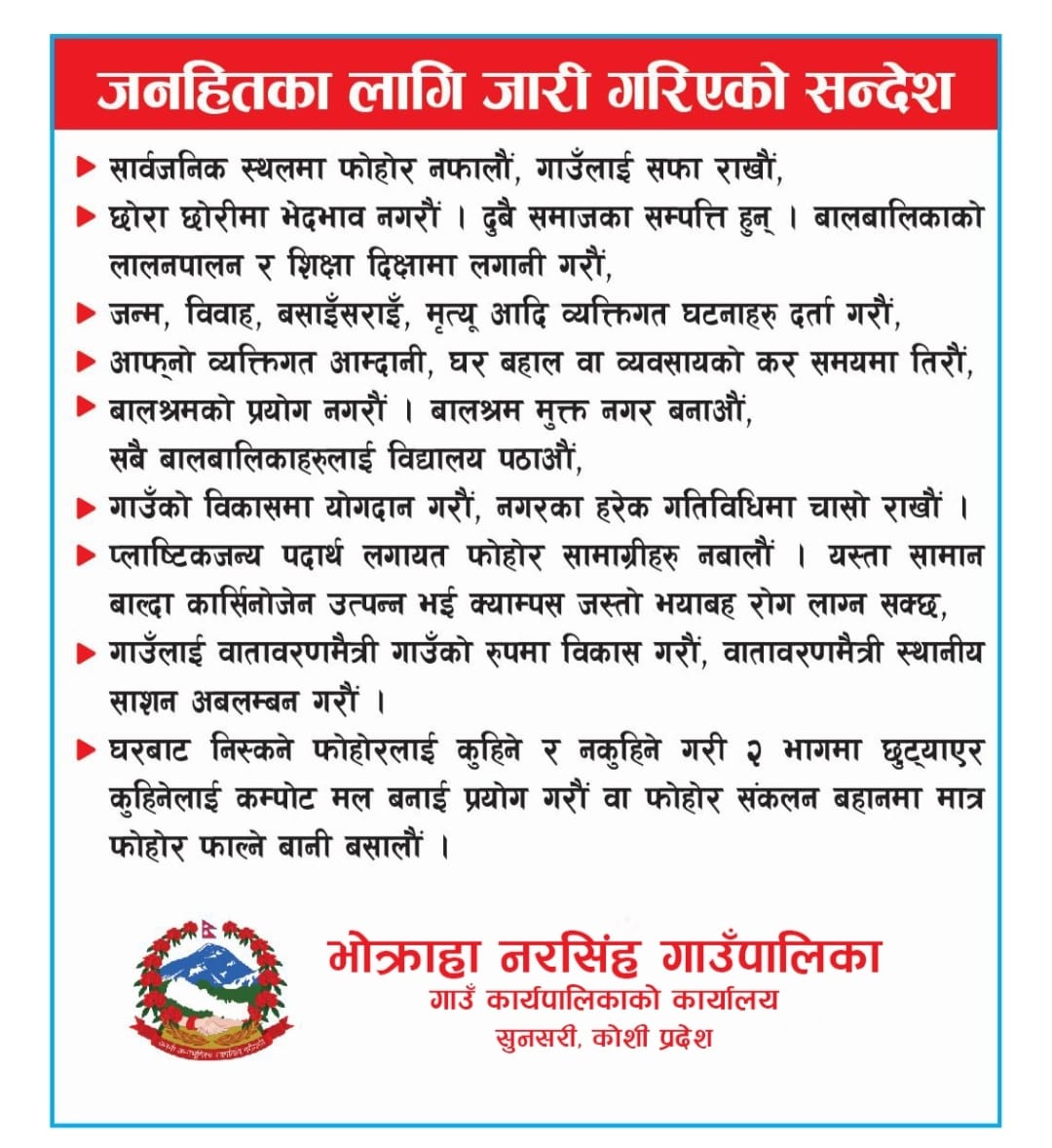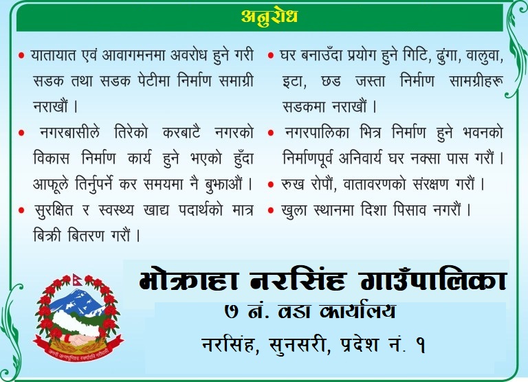 मुख्य कार्यालय : भोक्राहा नरसिंह गाउँपालिका ७, सुनसरी