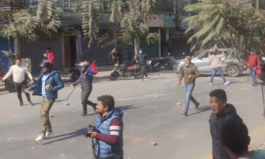 काठमाडौंमा प्रदर्शनरत युवा संघका कार्यकर्ता र मेडिकल व्यवसायी दुर्गा प्रसाईं समूहबीच ढुंगा हानाहान भएको छ।
