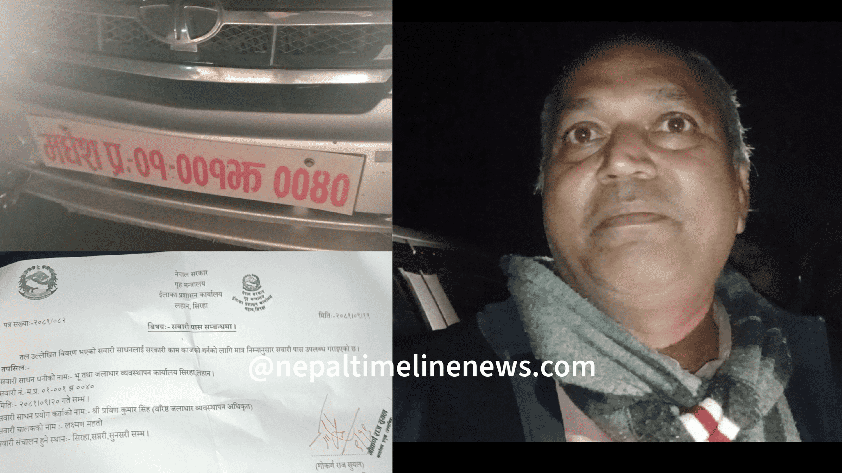 रविन्द्र यादव विराटनगर । सिराहाकाे, लहान भू तथा जलाधार व्यवस्थापन कार्यालयकाे मधेश प्र-०१-००१६ ००80 नम्बरको सरकारी गाडी दुरुपयोग गरेको फेला परेको छ ।