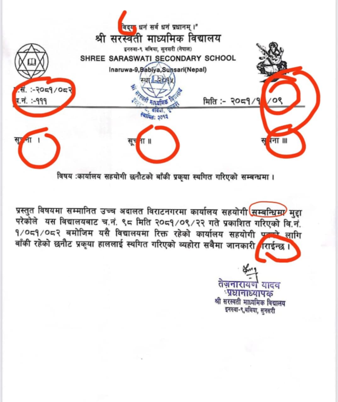सुनसरीको इनरुवा नगरपालिका–९, बबियास्थित सरस्वती माध्यमिक विद्यालयका निमित्त प्रधानाध्यापक तेजनारायण यादवले विवादास्पद सूचना जारी गरी आलोचनाको सामना गरिरहेका छन्। पुस ८ गतेका लागि जारी गरिनुपर्ने सूचना पुस ९ गतेको रूपमा सार्वजनिक गर्दै यादवले विद्यालय प्रशासनमा प्रश्नचिन्ह खडा गरेका छन्।